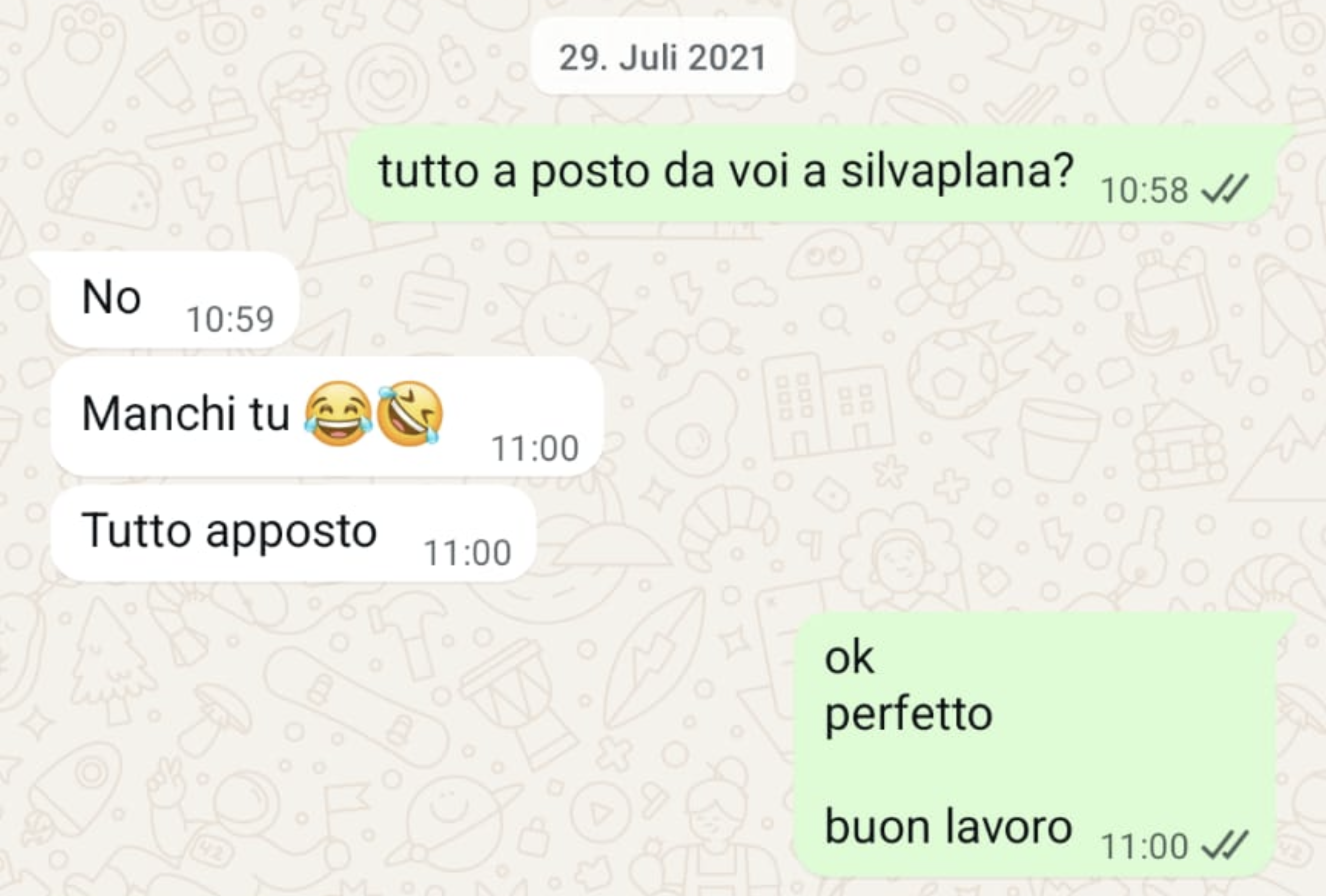 «Flirty» schon seit Anbeginn: «Alles gut bei Dir?», fragt Giovanoli im Juli 2021. «Nein, Du fehlst», schreibt die Mitarbeiterin zurück. Sie hatte 2021 einen Saisonjob bei Giovanoli im Oberengadin.